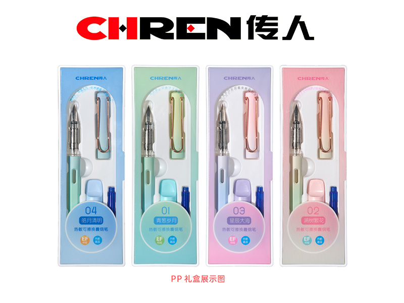 3、每小盒内含1支EF大尖换囊钢笔+1支热敏可擦墨囊(通用3.4mm)+1支润笔器。