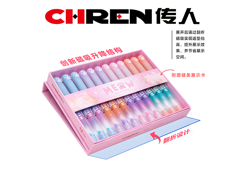 产品特点:传人磁吸猫爪流沙钢笔采用萌趣猫爪磁吸设计,套入笔套即可自动吸附,快速磁吸,取用轻松;热敏可擦,笔尾附带可擦橡皮头,写错就改,一擦即净,建议搭配传人热敏可擦墨囊使用;正姿软握,久写不累手,握笔不打滑。笔尾搭配幻流沙,四色渐变流光溢彩,软萌颜值拉满,让书写兼具实用性与治愈乐趣。